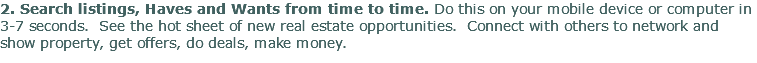Once a day or periodically, click on the icon on your home screen, one second to open iciworld, choose commercial, residential, etc. one second, click on search database . . . one second . . . presto the latest Haves and Wants appear on the screen. Make choices to sort by price, choose a city, etc. Make connections, develop good business relationships, build your database of people, show property, make money.