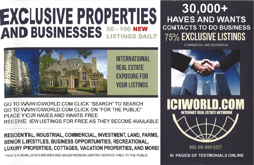 | iciworld.com, Inc. Since 1994 (The Market ICI World Real Estate Network) Canada:131 Bloor St. W., Suite 200 Toronto, Ontario, Canada M5S 1R8 Bus. 416-840-6227 After hours and weekends 416-214-4875 USA: 1110 N Riverside Dr., Unit #28 , Pompano, Florida 33062 Bus. 954-317-2327 USA www.iciworld.us Canada www.iciworld.ca World www.iciworld.com 30,000+ real estate Have and Want ads, 50,000 readership. See testimonials. www.retiredbrokers.com | www.referralbrokers.com Full training and telephone technical support Contact us free world wide |